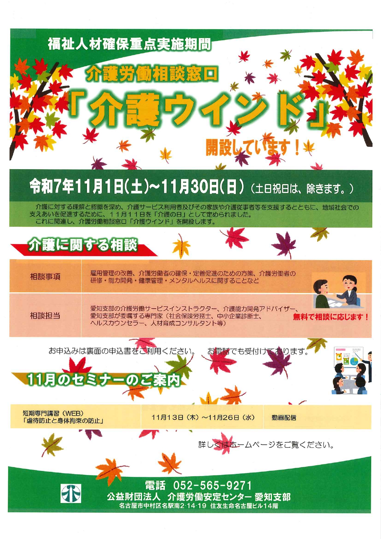 介護労働安定センター愛知支部では、11月11日の「介護の日」を中心とした福祉人材確保重点実施期間に合わせて、介護労働に関する無料相談を実施します。