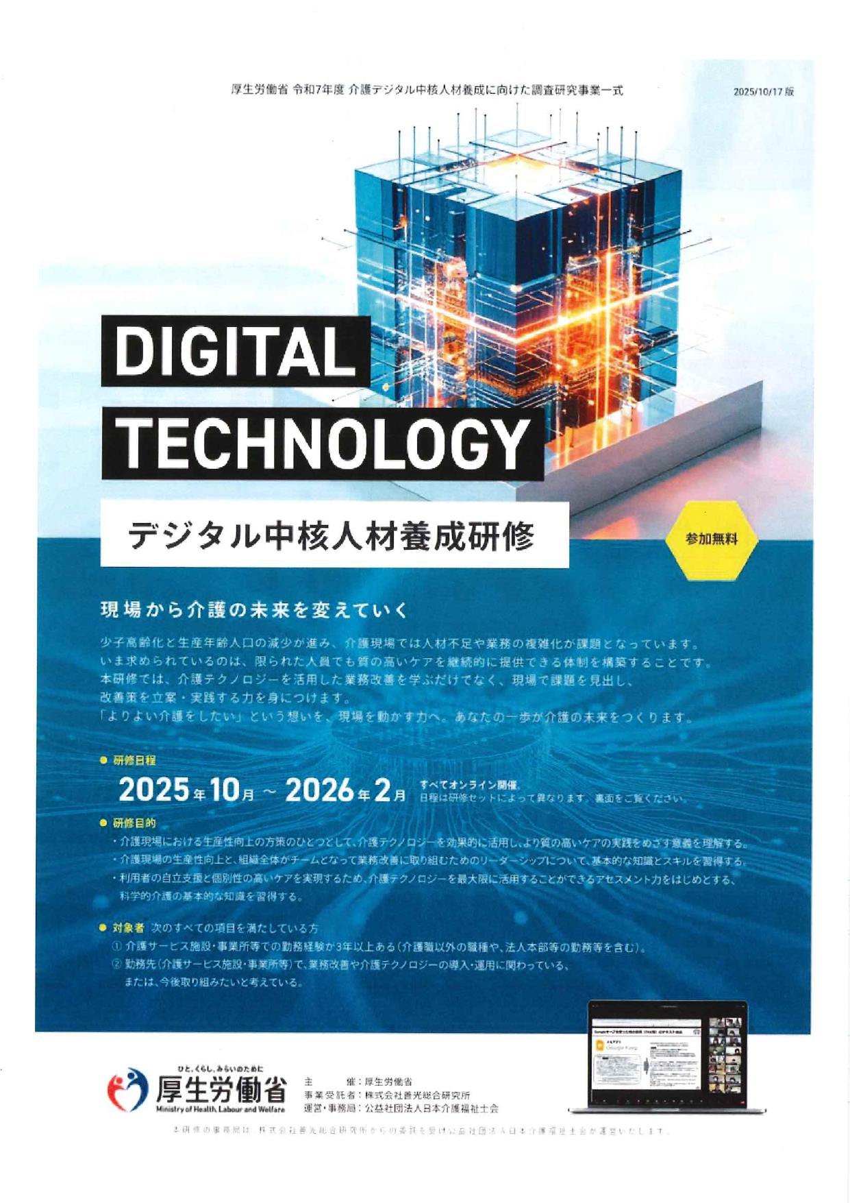 介護現場における生産性向上の方策のひとつとして、介護テクノロジーを効果的に活用し、より質の高いケアの実践をめざす意義を理解する。介護現場の生産性向上と、組織全体がチームとなって業務改善に取り組むためのリーダーシップについて、基本的な知識とスキルを習得するために、「デジタル中核人材養成研修」を開催します。(参加無料)