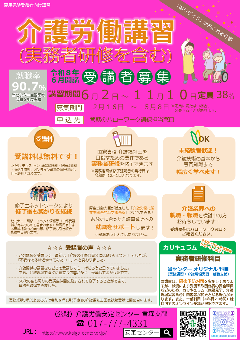 令和8年度 介護労働講習の受講生募集中です。