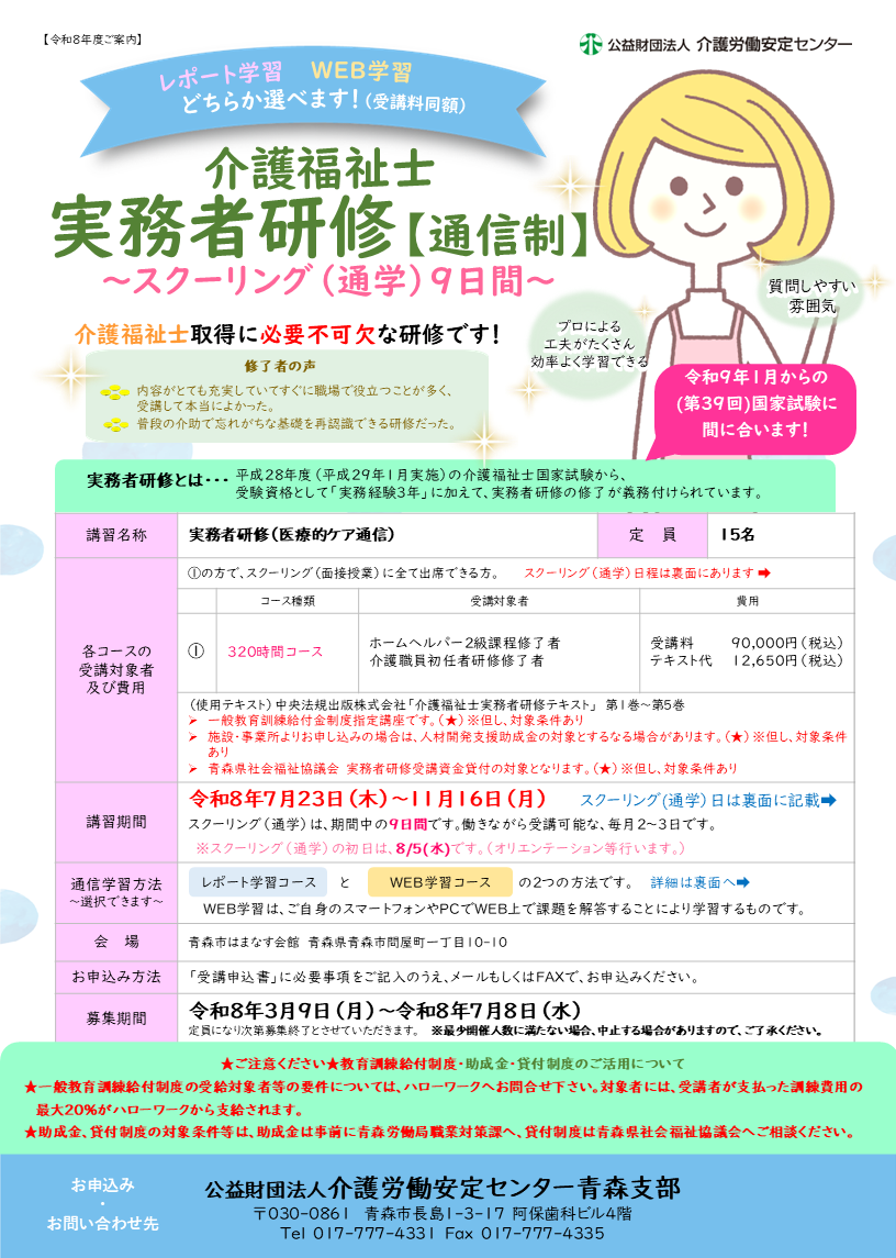 令和8年度 介護福祉士実務者研修【通信制】の受講生を募集しています。