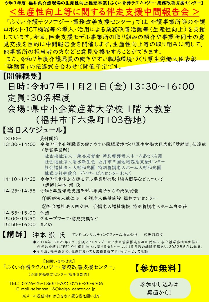 介護事業所における介護テクノロジーの効果的な活用による業務改善等を促進するため、伴走支援モデル事業所の取組の紹介や事業所同志の意見交換会を目的に中間報告会を開催します。