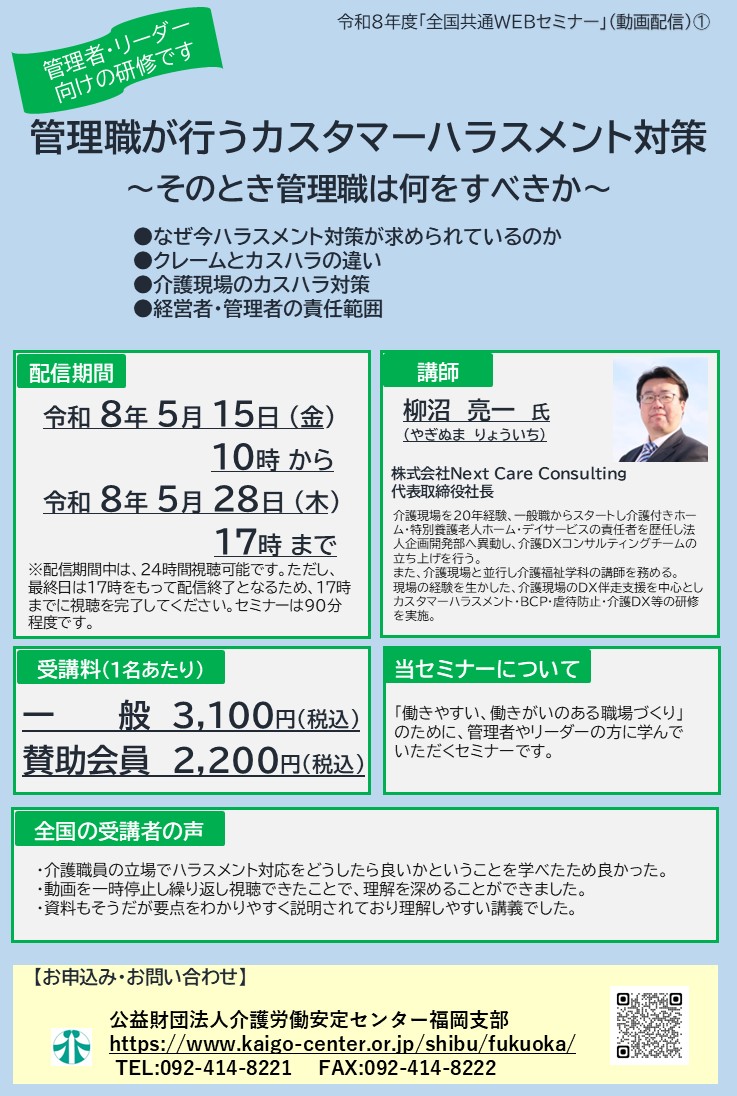 その他詳細につきましては、介護労働安定センター福岡支部(TEL 092-414-8221)までお問い合わせ下さい(^^♪