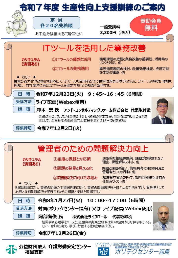 12/23「ITツールを活用した業務改善」 1/27「管理者のための問題解決力向上」