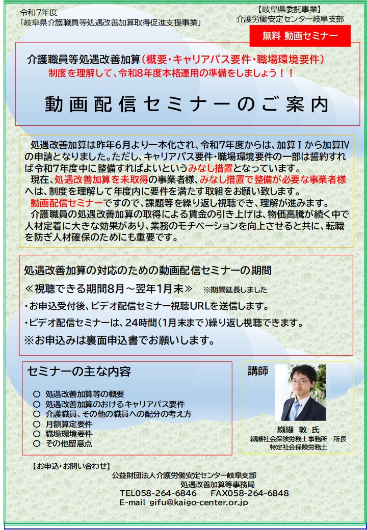 更新! ◎介護職員等処遇改善加算動画配信セミナーのご案内(無料) ※キャリアパス要件・職場環境要件は、令和7年度内に整備していただく必要がありますので、 (事務担当者が異動されるなどでお困りの場合は、是非動画配信セミナーをご視聴ください!!) ※キャリアパス要件、職場環境要件を年度内に整備していただくため、上記の「介護職員等処遇 ≪セミナー内容≫約90分 ≪配信期間8月1日から令和8年1月末日まで≫24時間視聴可能 ※申し込みは、「FAX」または、メールで受付中!! ●メールの場合は、下段のFAX申込書ダウンロードいただき、諸事項を記入して ・申込FAX(058-264-6848)までお願いします。 ※お申し込み後は、セミナー資料と視聴URLをご指定のEmailヘお送りします。