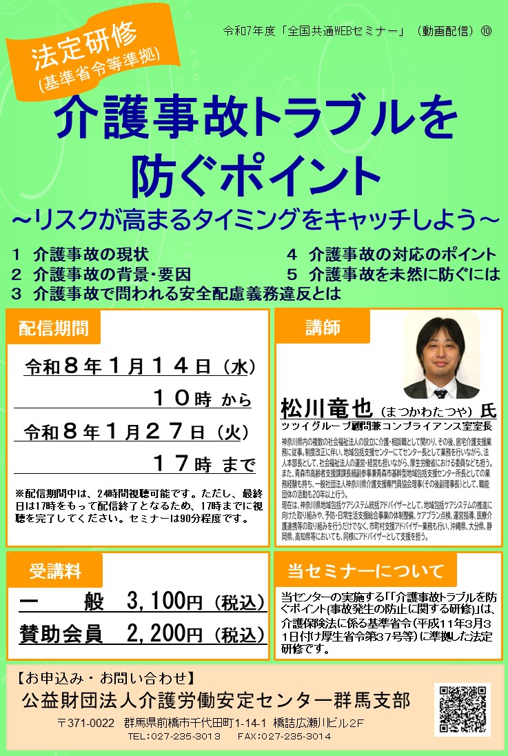 【募集中】Webセミナー「介護事故トラブルを防ぐポイント」R8,1/14~1/27