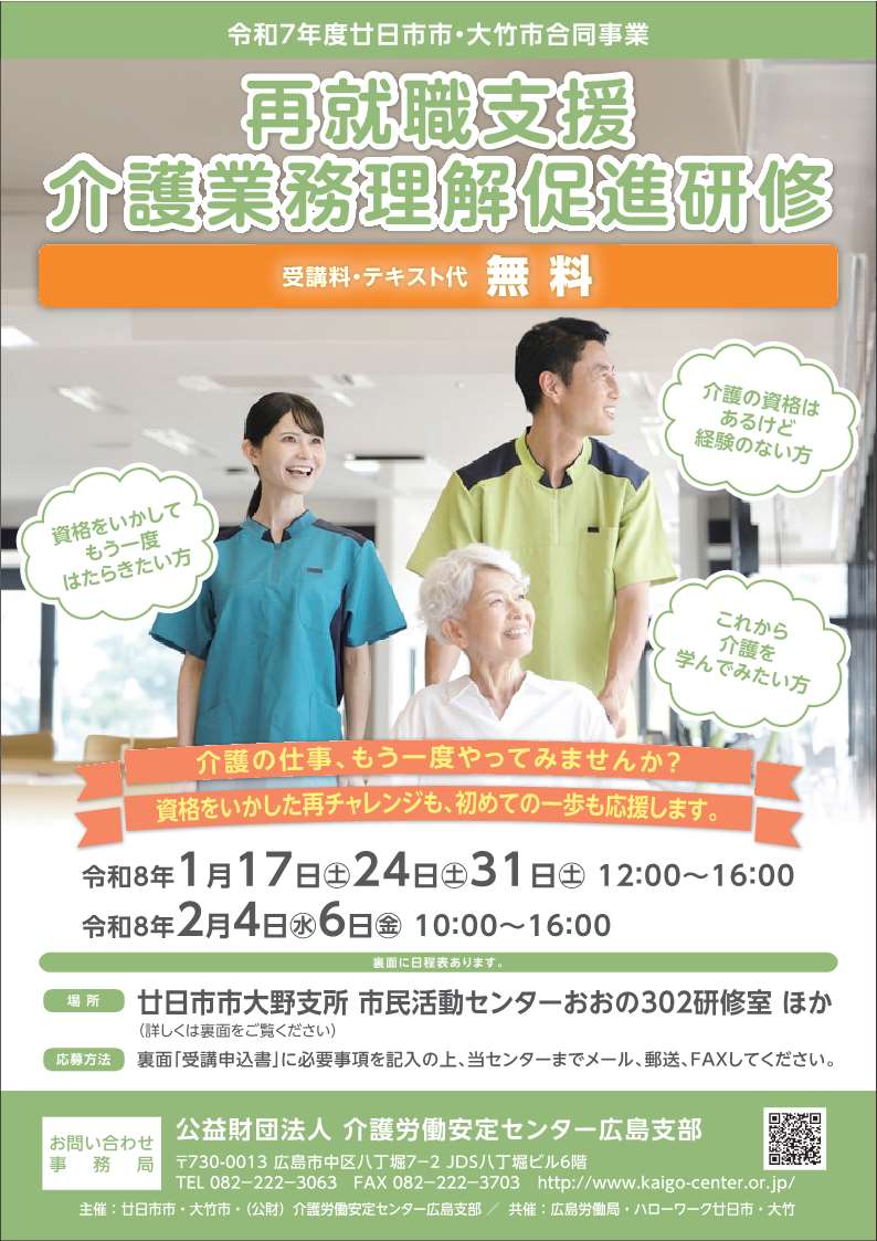 ※無料※ 再就職支援 介護業務理解促進研修(大竹市・廿日市市)のご案内