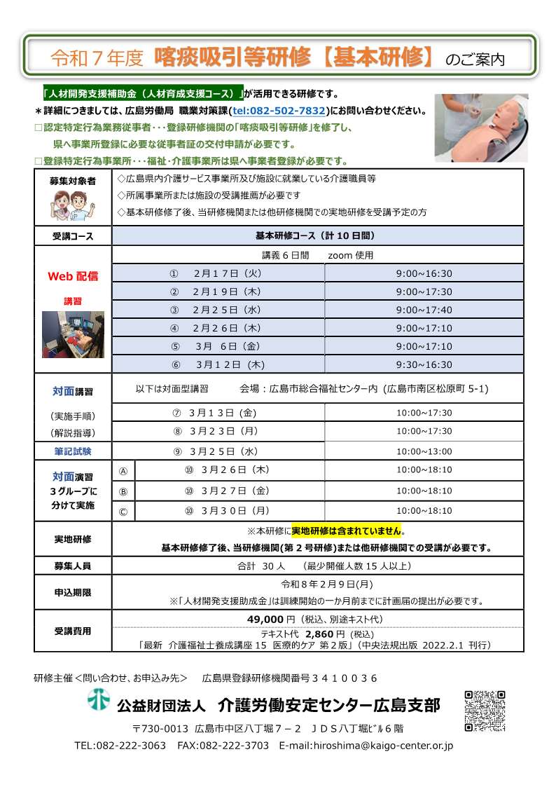 令和8年2月17日 開講!まずはお問い合わせください。 お問合せは介護労働安定センター広島支部まで(082-222-3063)