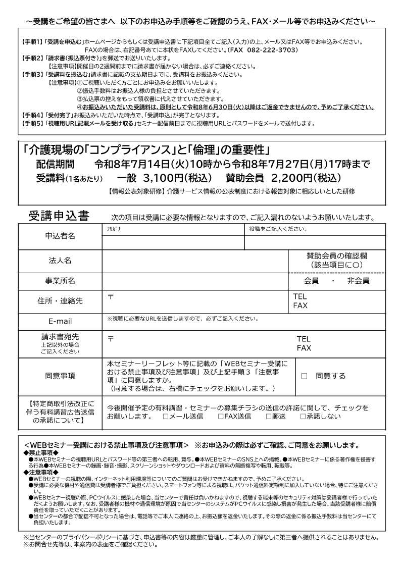 WEBからのお申し込みは ==> こちらから FAX からのお申し込みは ==> 「介護現場の『コンプライアンス』と『倫理』の重要性」