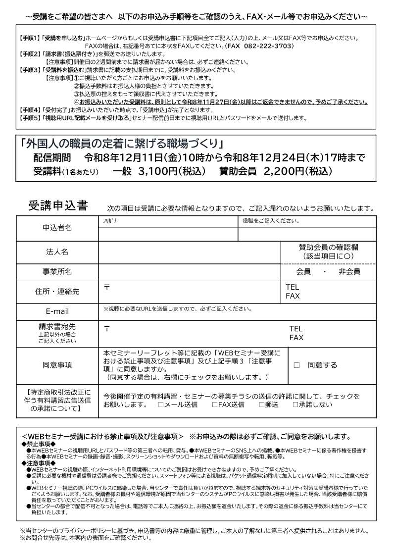 WEBからのお申し込みは⇒⇒こちらから FAXからのお申し込み ⇒⇒外国人の職員の定着に繋げる職場づくり