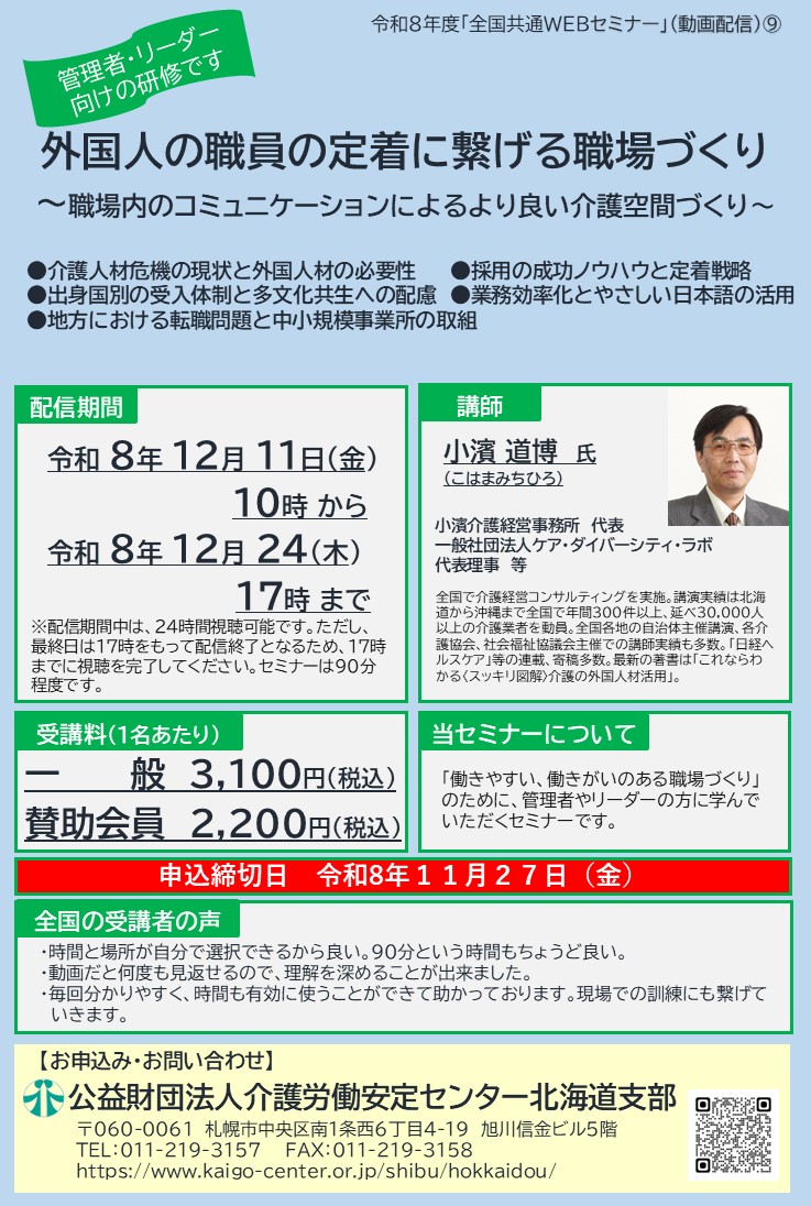 - 「外国人の職員の定着に繋げる職場づくり」動画配信【12/11~12/24配信】講師:小濱 道博 氏