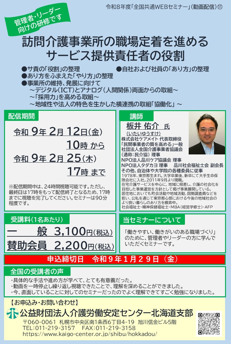 - 「訪問介護事業所の職場定着を進めるサービス提供責任者の役割」動画配信【R9/2/12~2/25配信】講師:板井 佑介 氏