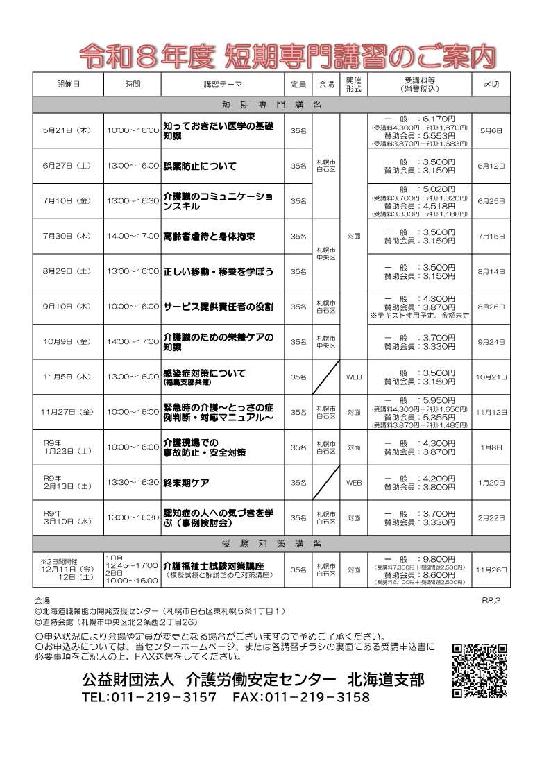 - ※NEW※ 令和8年度 講習セミナー一覧表(介護従事者向け)
