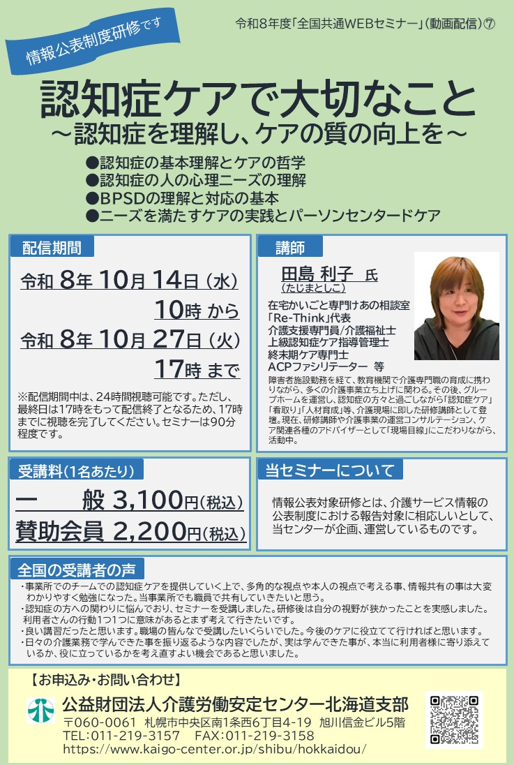 「認知症ケアで大切なこと」動画配信セミナー(講師:田島利子氏)を開催いたします。