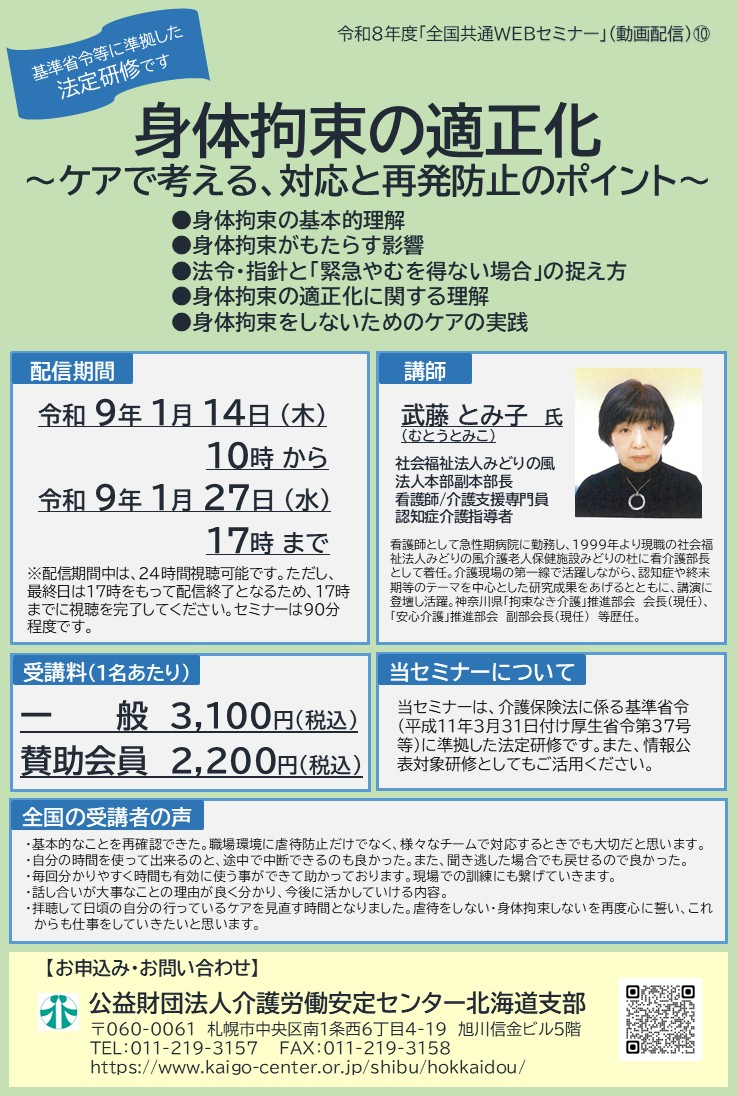 「身体拘束の適正化」 動画配信セミナー(講師:武藤とみ子氏)を開催いたします。