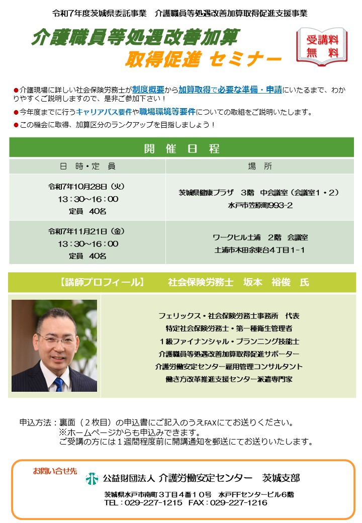 - 令和7年度 介護職員等処遇改善加算取得促進セミナー 10/28,11/21【集合】