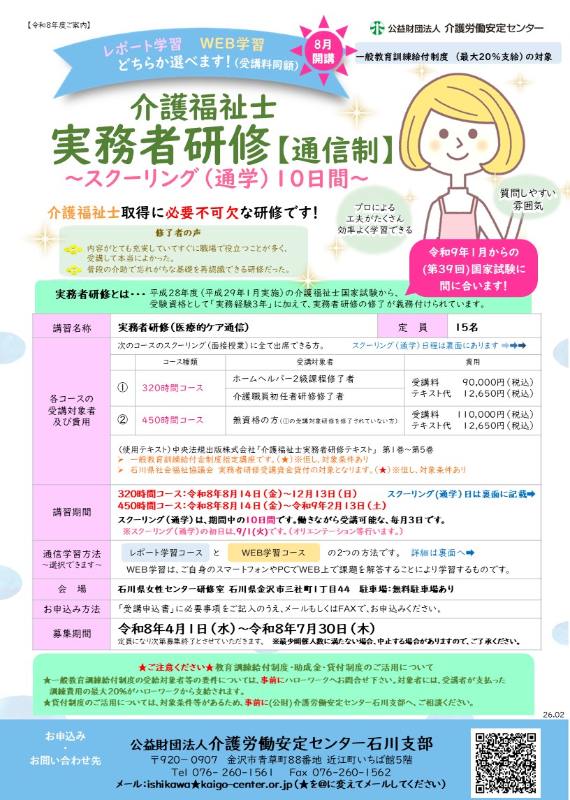 - 令和8年度 通信制「介護実務者研修(320h・450h)」のご案内
