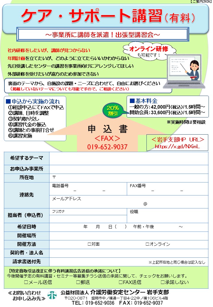 お申込みは「ケア・サポート講習(有料)」の申込書に必要事項を記載の上、FAX(019-652-9037)まで