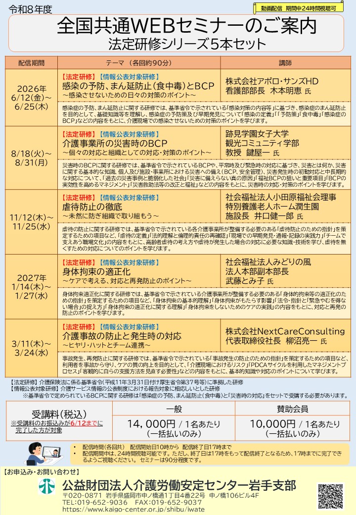 ご案内のチラシ・FAXでの申込はこちらから ⇒ 令和8年度_全国共通Webセミナー(法定研修シリーズ5本セット)
