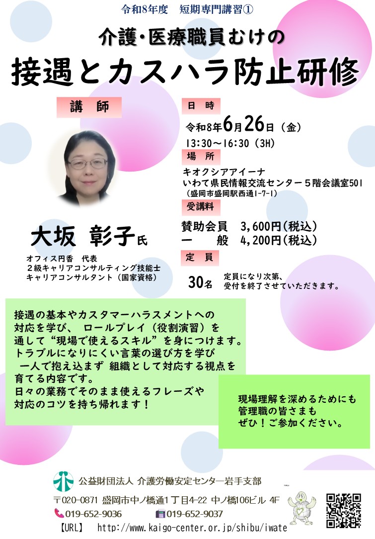 ご案内のチラシ・FAXでの申込はこちらから ⇒ 短期専門講習「介護·医療職員むけの接遇とカスハラ防止研修」