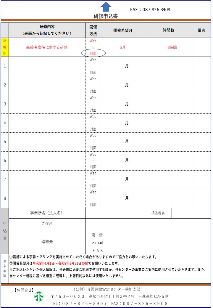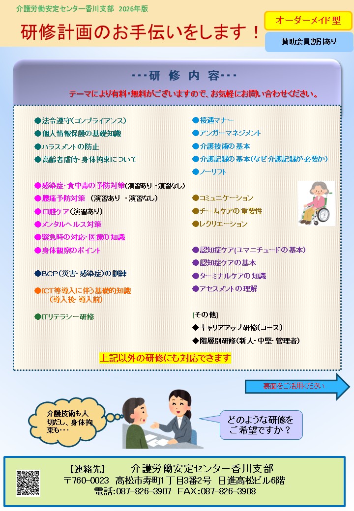 介護労働安定センター香川支部では介護事業所様の研修実施のための支援をいたします。