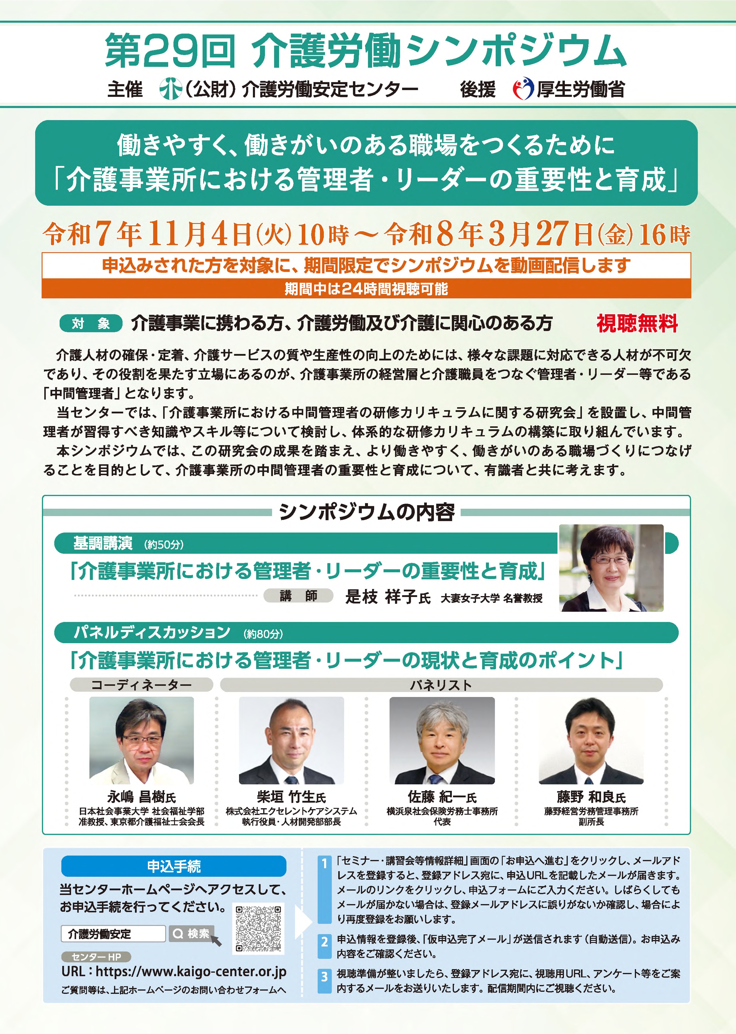 - 【視聴無料】第29回介護労働シンポジウムのご案内 (主催:公益財団法人介護労働安定センター 後援:厚生労働省)