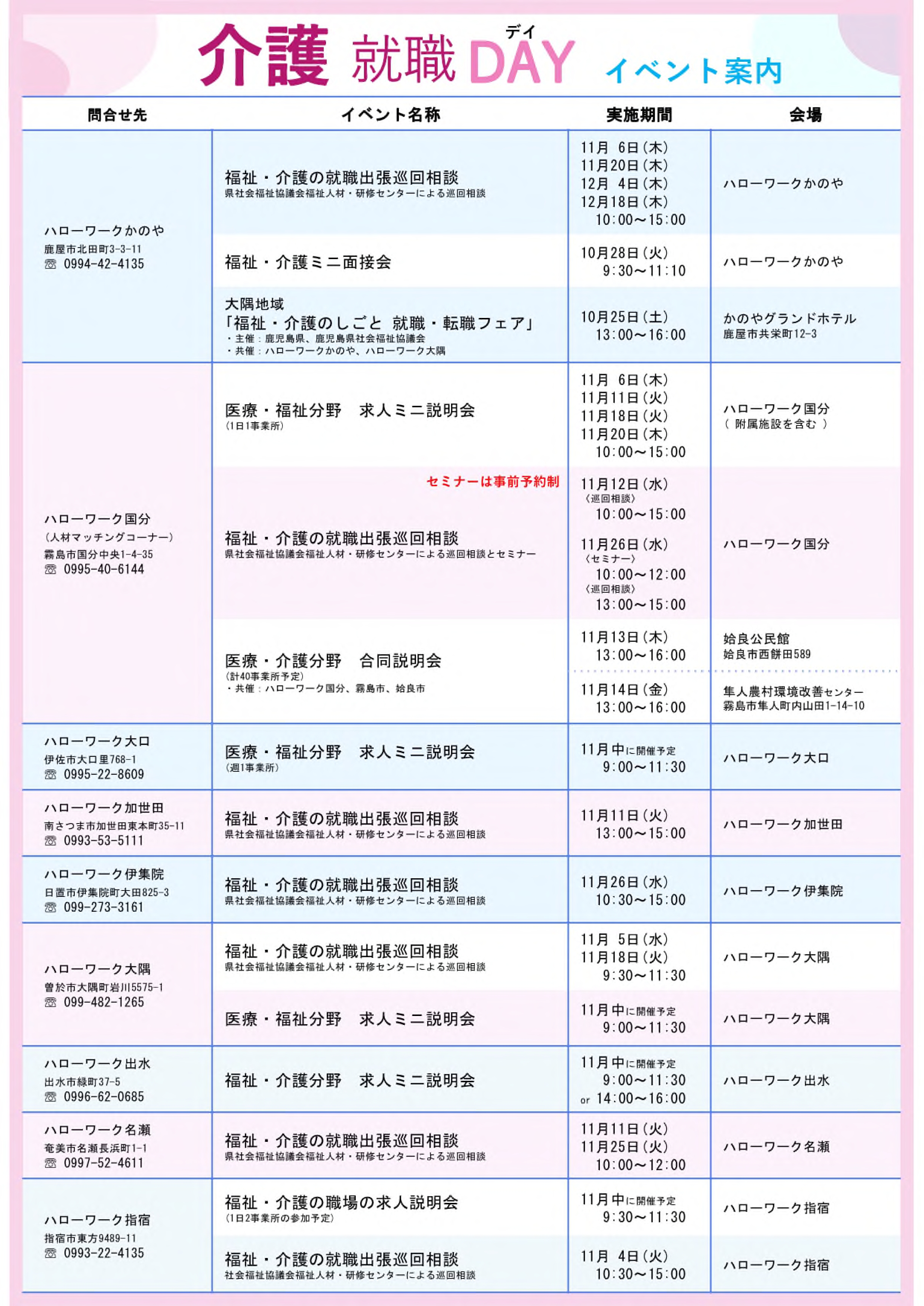 - 【鹿児島労働局職業対策課からのお知らせ】介護関係就職面談会 (通称「介護就職デイ」)