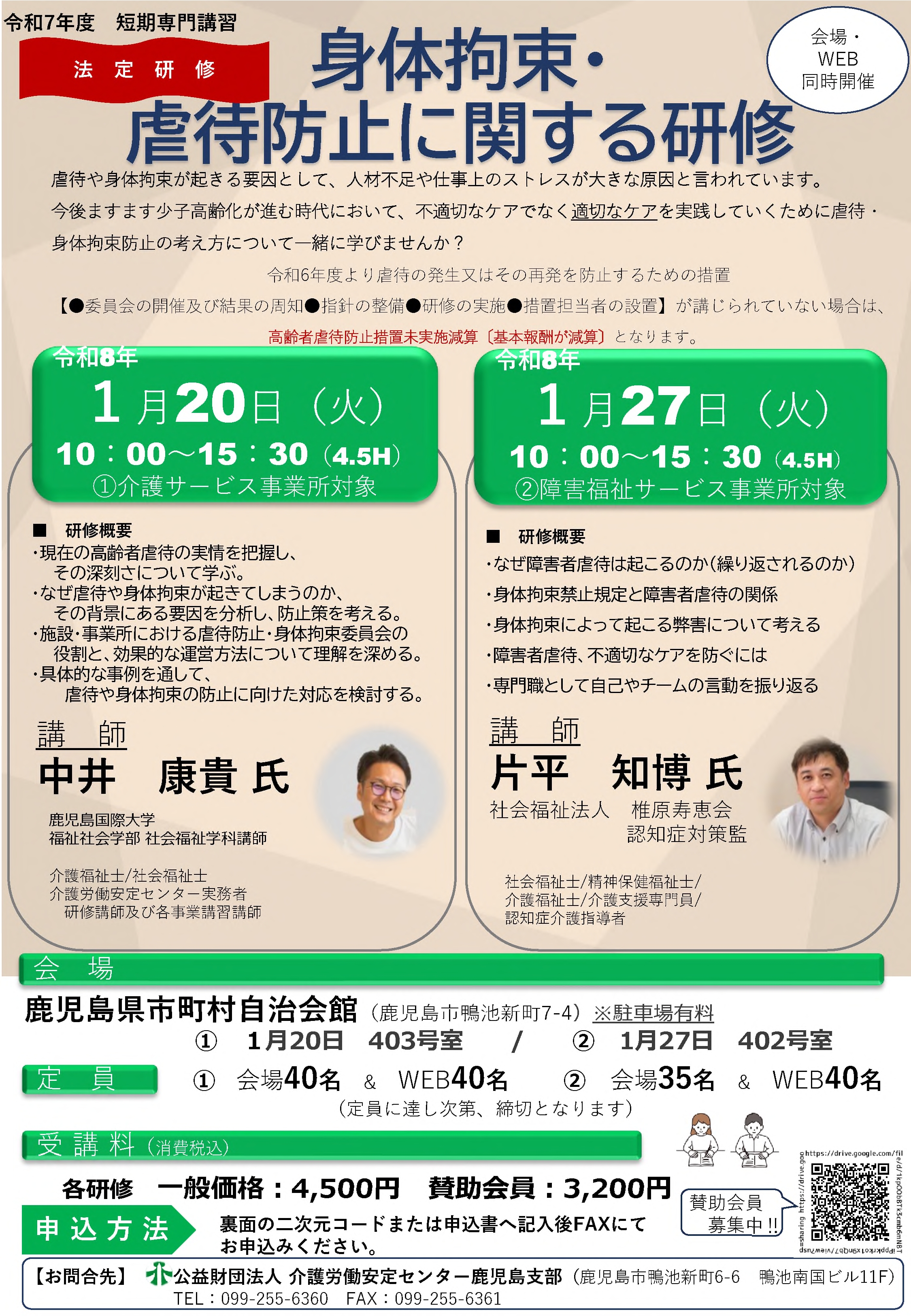 令和7年度短期専門講習(法定研修)といたしまして、令和8年1月20日(火)