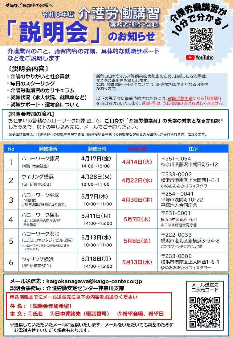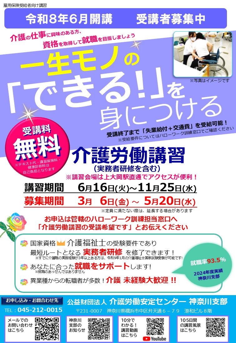 下記のとおり、令和8年度介護労働講習受講者の募集を開始します。