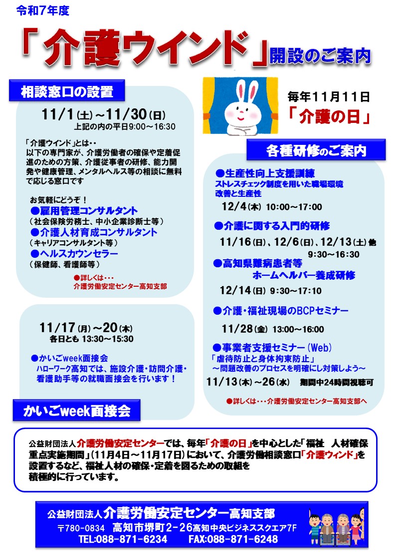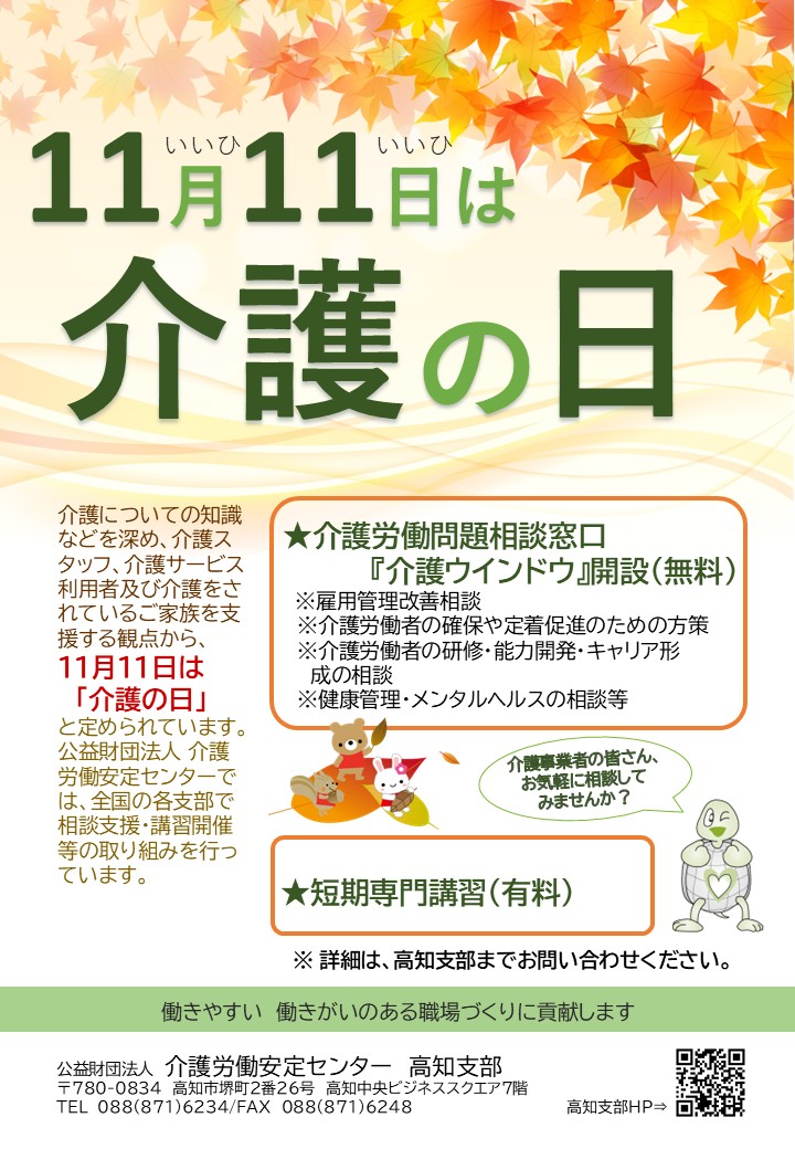 介護労働安定センター高知支部では、11月11日の「介護の日」に合わせて 「介護ウインド」を設置いたします。