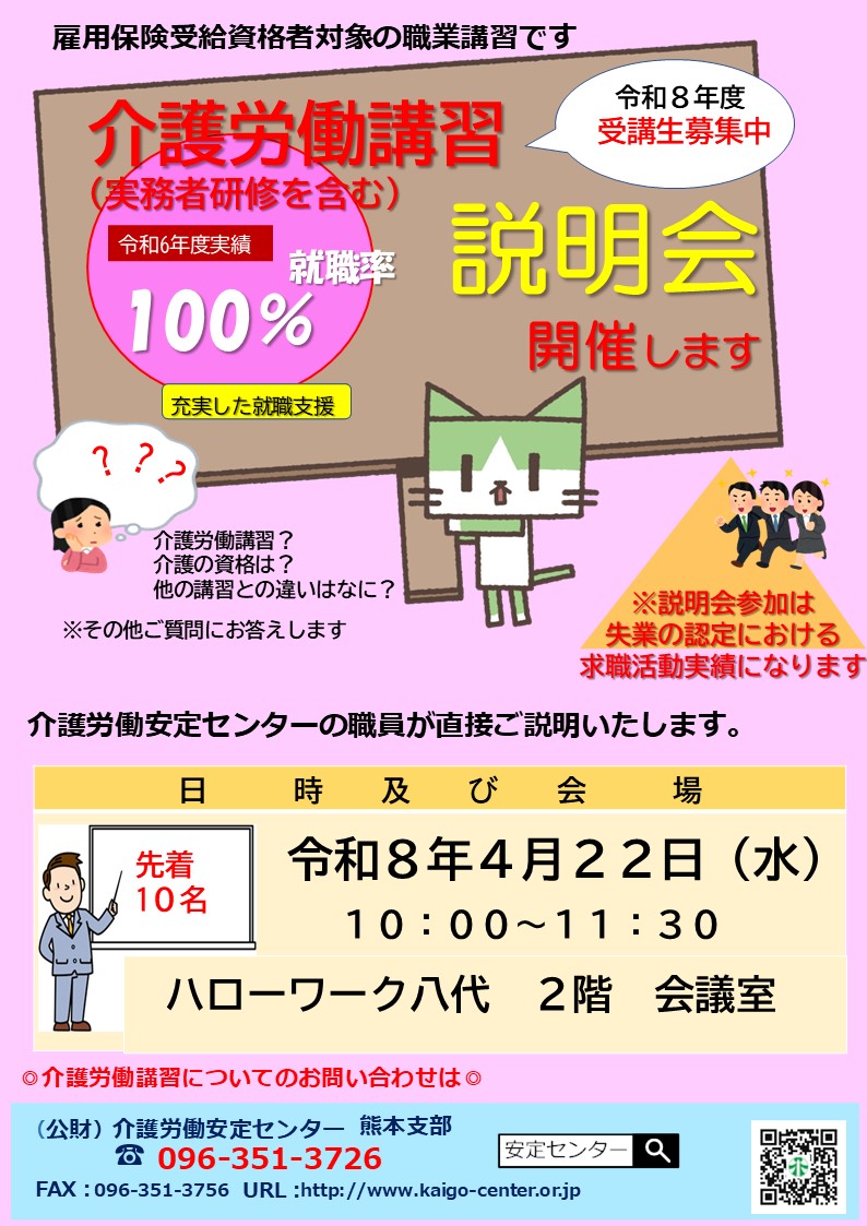 【八代地区】令和8年度介護労働講習(実務者研修を含む)求職者向け説明会のお知らせ!