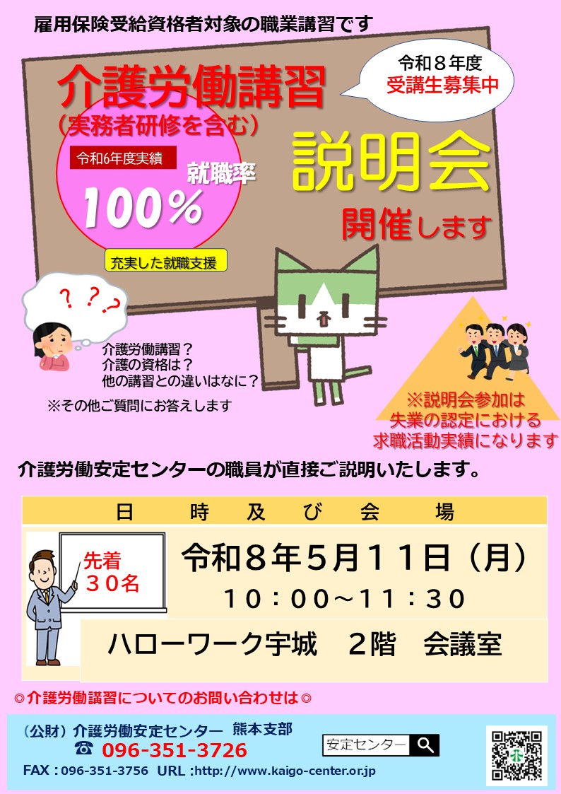 【宇城地区】令和8年度介護労働講習(実務者研修を含む)求職者向け説明会のお知らせ!