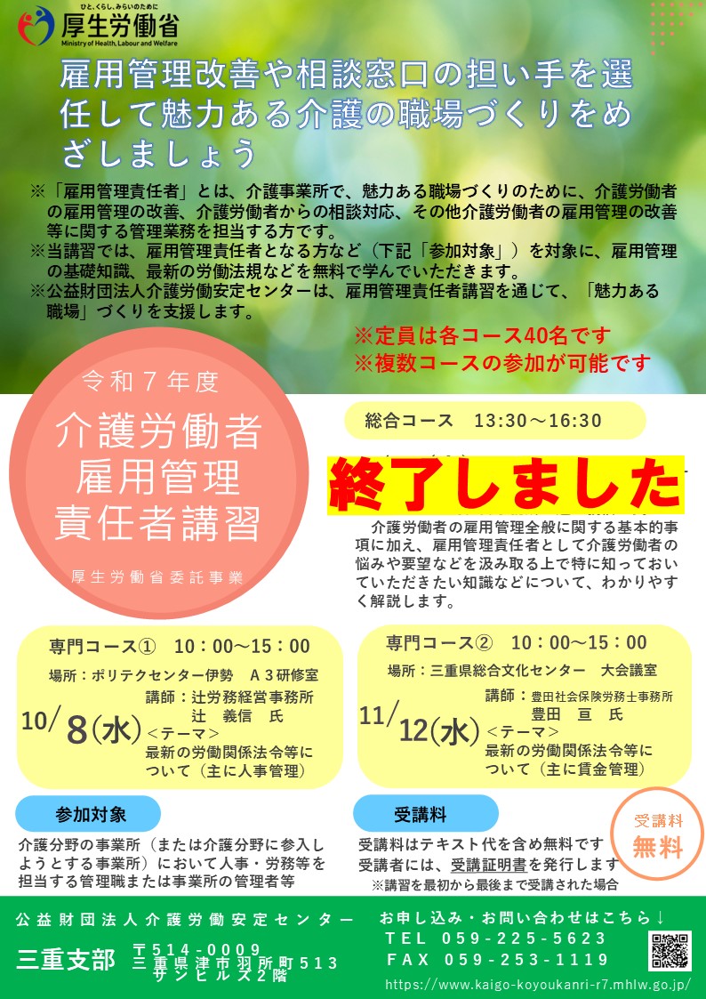 - 【申込受付中】【厚生労働省委託事業】「令和7年度介護労働者雇用管理責任者講習」のご案内