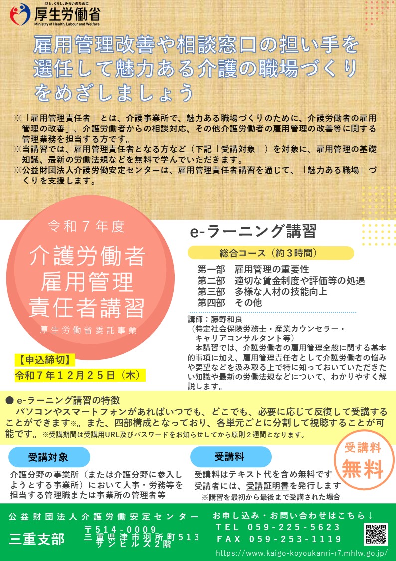 - 【厚生労働省委託事業】「令和7年度介護労働者雇用管理責任者講習」(e-ラーニング)のご案内