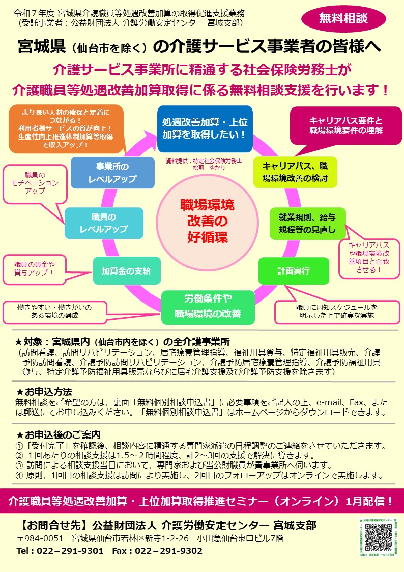 宮城県からの委託を受け、主に処遇改善加算未取得の事業所及び