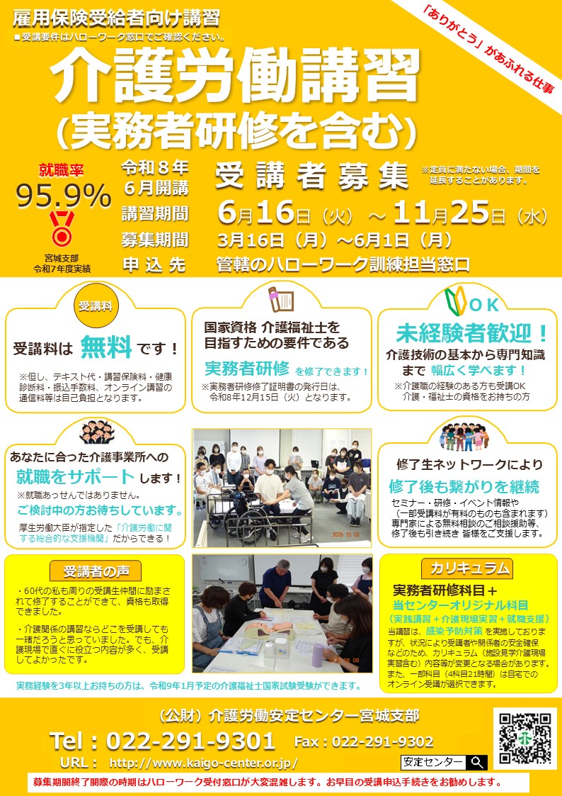 ■講習内容のお問合せは、介護労働安定センター宮城支部まで(022-291-9301)
