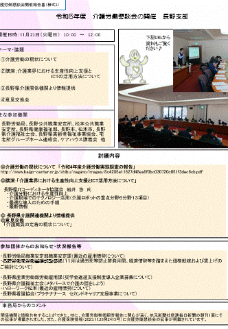 介護労働安定センターでは毎年介護労働懇談会をおこなっております。 この会は行政機関や介護関係団体、その他関係機関等でネットワークを作り介護分野の人材確保及び定着を図るために情報交換・共有・役割分担などを