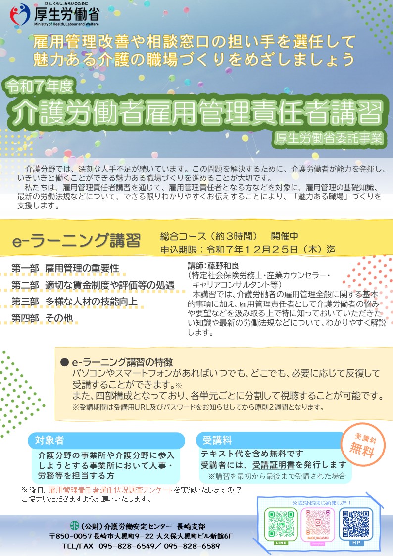 令和7年度介護労働者雇用管理責任者講習e-ラーニングの受講申込を受け付けております。