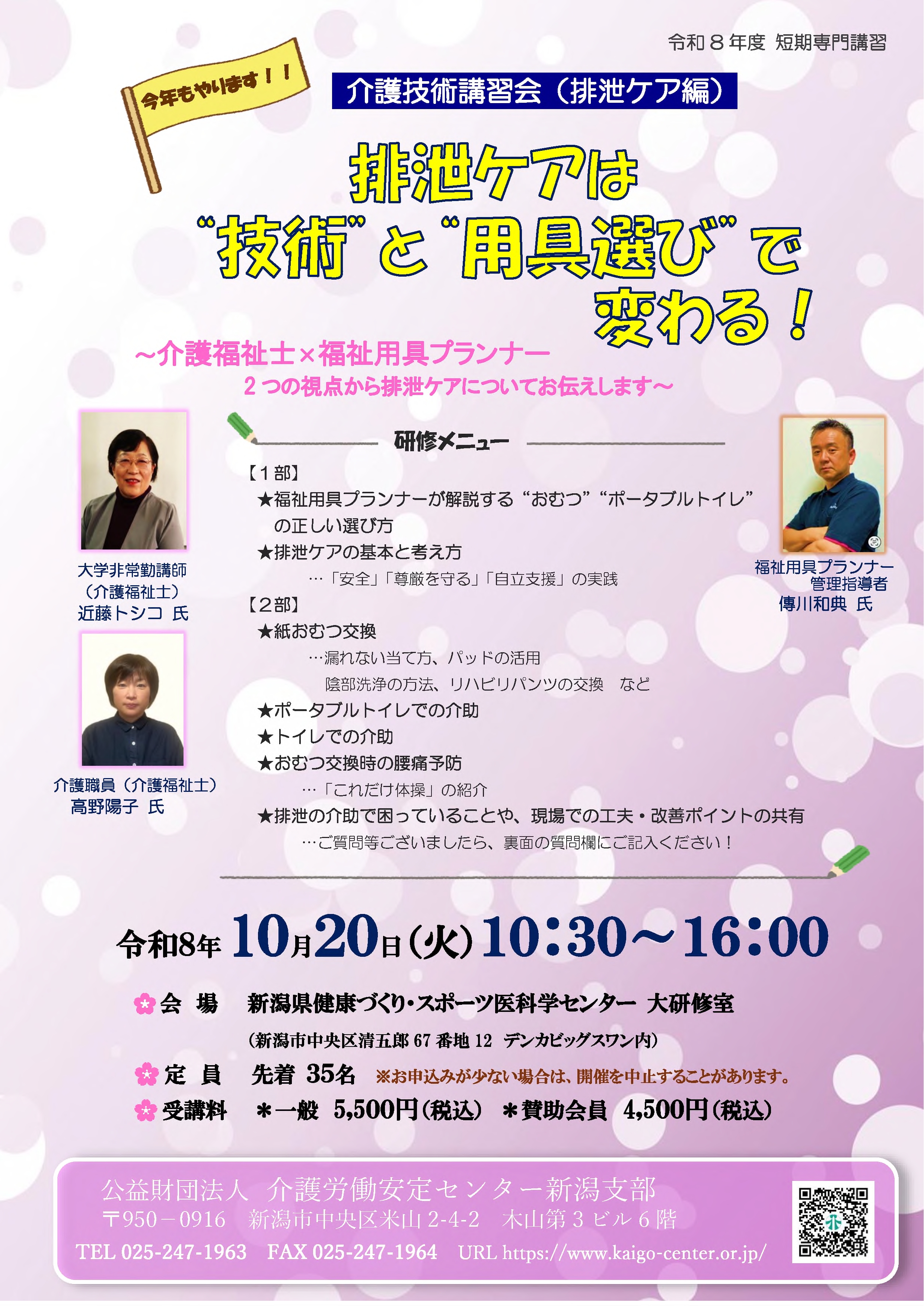 令和8年度第2回 新潟支部短期専門講習 「介護技術講習会(排泄ケア編)~排泄ケアは“技術”と“用具用具選び”で変わる!~」