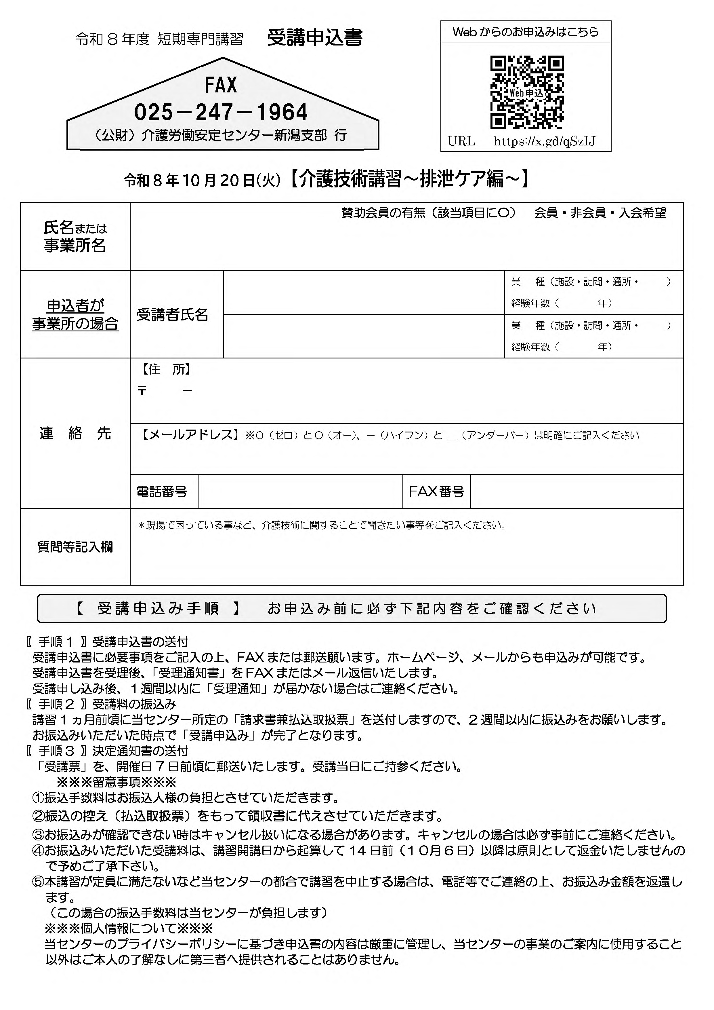 - 令和8年度第2回 新潟支部短期専門講習 「介護技術講習会(排泄ケア編)~排泄ケアは“技術”と“用具用具選び”で変わる!~」