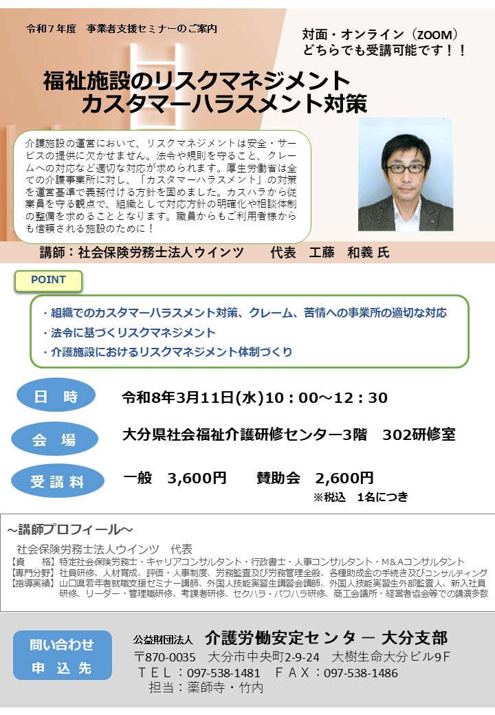 - 事業者支援セミナー 3月11日「福祉施設のリスクマネジメント・カスタマーハラスメント対策」開催のご案内