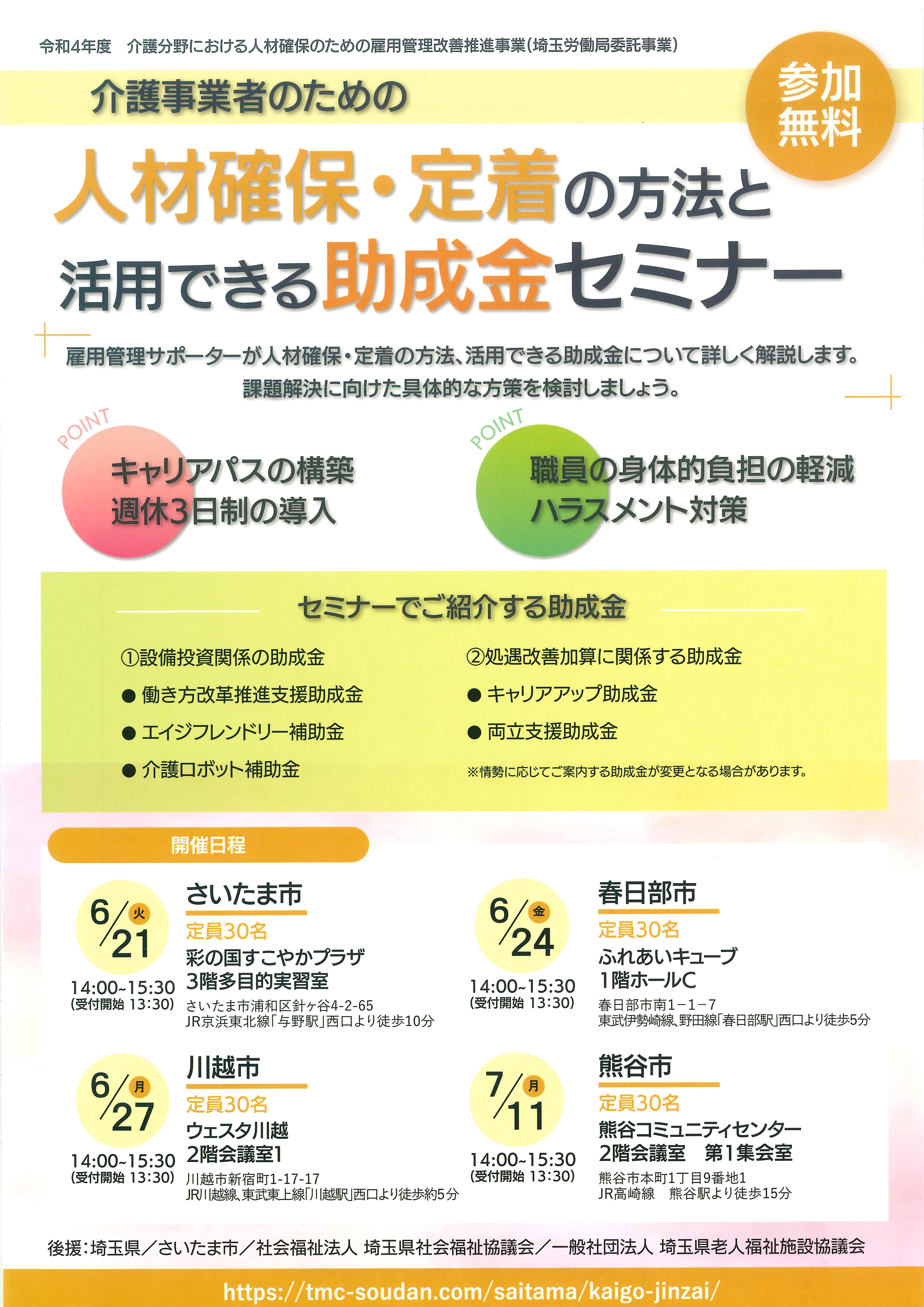 介護分野における人材確保のための雇用管理改善推進事業を開催しています。 ◆詳細はこちら◆ ・介護分野における人材確保のための雇用管理改善推進事業 ・人材確保定着の方法と活用できる助成金セミナー