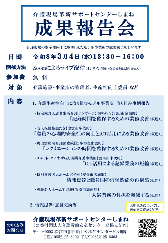今年度、介護現場の生産性向上に取り組んだモデル事業所の成果報告を行います。県内事業所さまのお話を伺い、自事業所の参考になさいませんか?