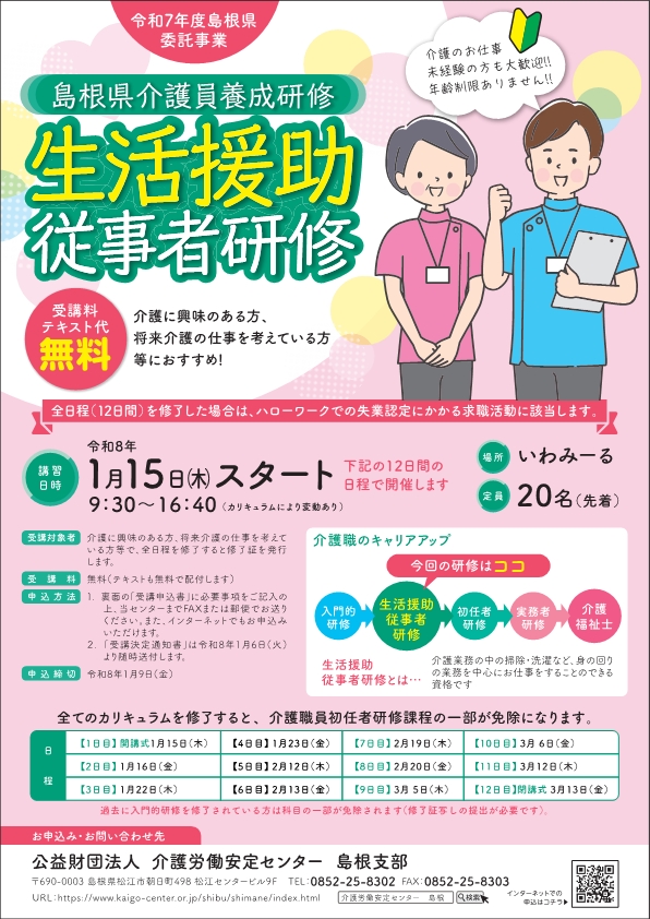 【対面】生活援助従事者研修課程(島根県介護員養成研修)R8年1月15日開講!