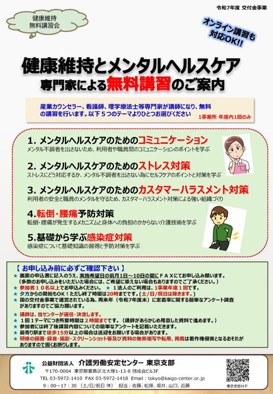 健康維持とメンタルへするケア専門家による無料講習(講師派遣)5つのテーマからお選びください