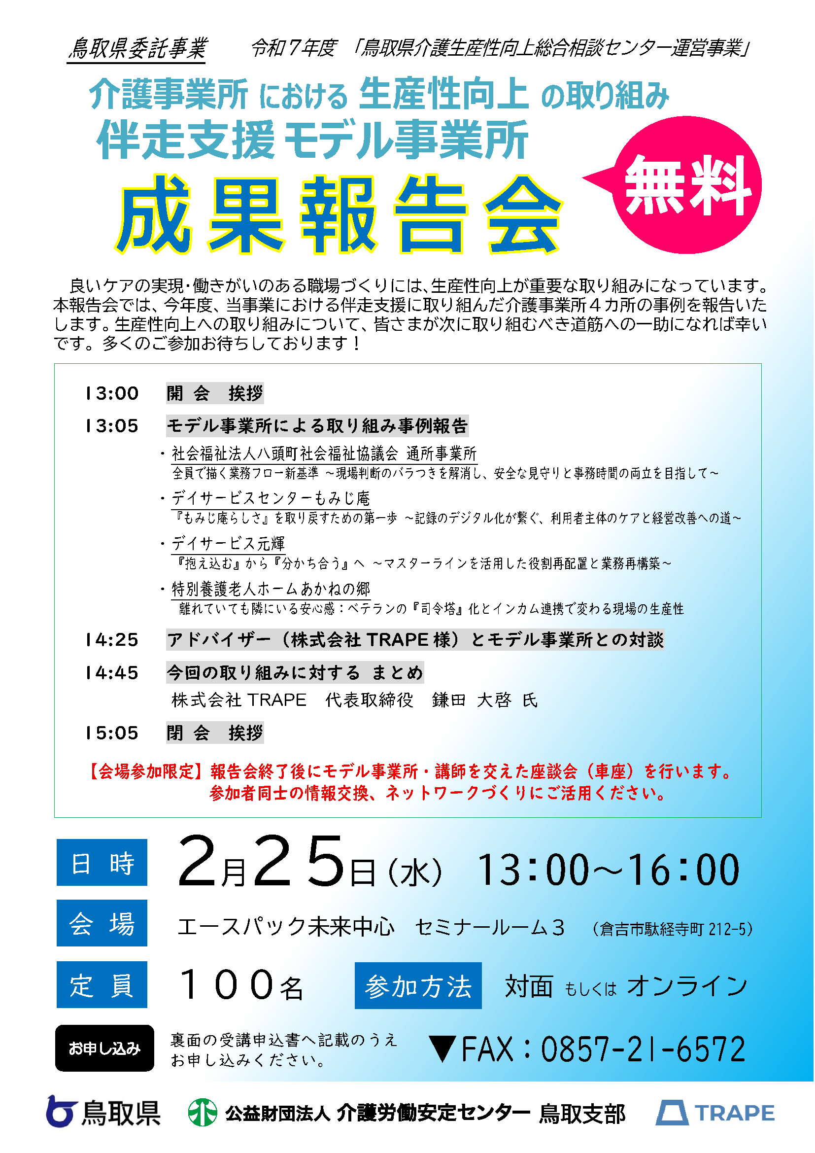 【募集中】鳥取県介護生産性向上総合相談センター運営事業「伴走支援モデル事業所の成果報告会」