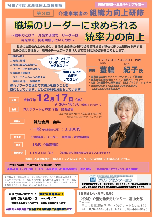 - ★12/17生産性向上支援訓練(第3回)「職場のリーダーに求められる統率力の向上」のご案内!
