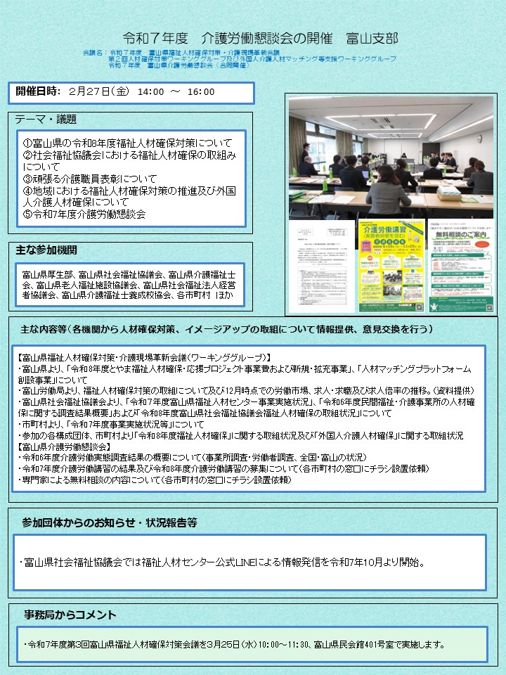 令和7年度「介護労働懇談会」を「富山県福祉人材確保対策・介護現場革新会議 第2回人材確保対策ワーキンググループ 第2回外国人介護人材マッチング等支援ワーキンググループ」と合同で開催しました。