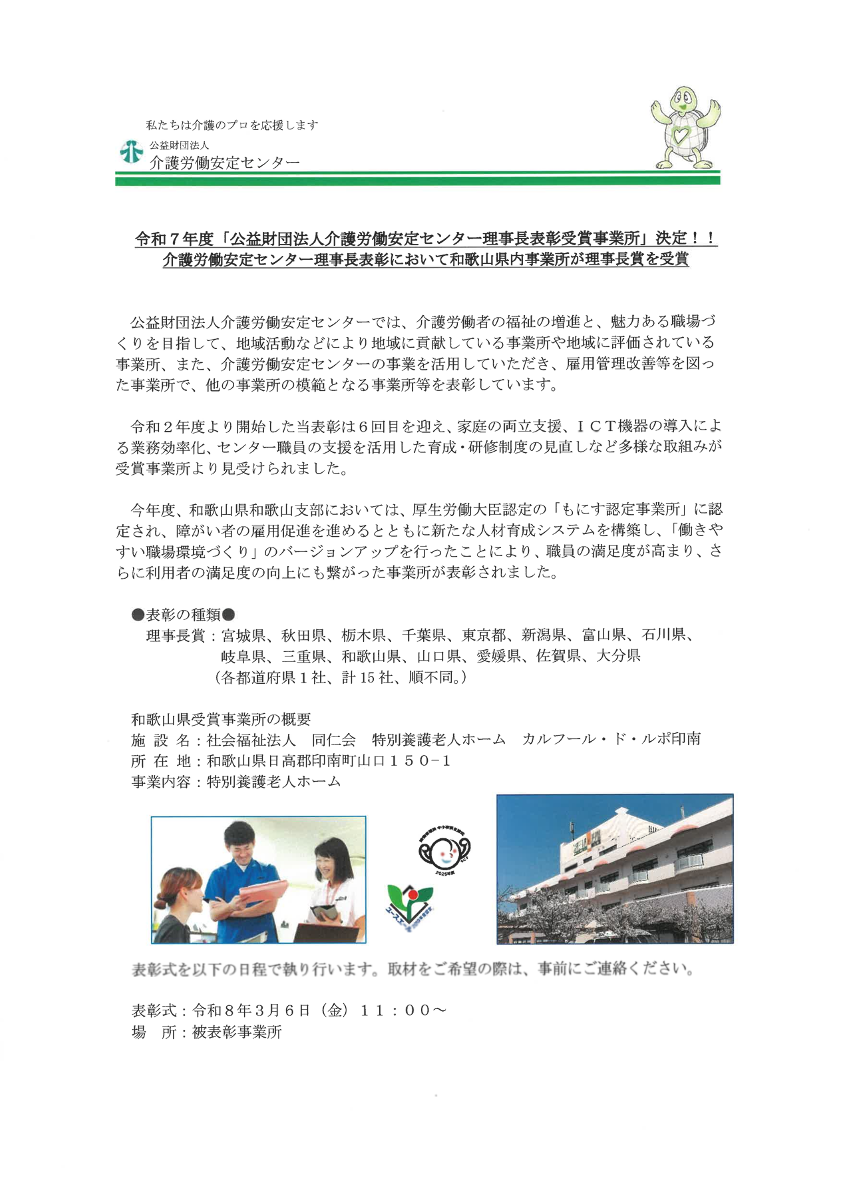 令和7年度は下記の通り、特別養護老人ホーム カルフール・ド・ルポ印南(日高郡印南町)様が選出され
