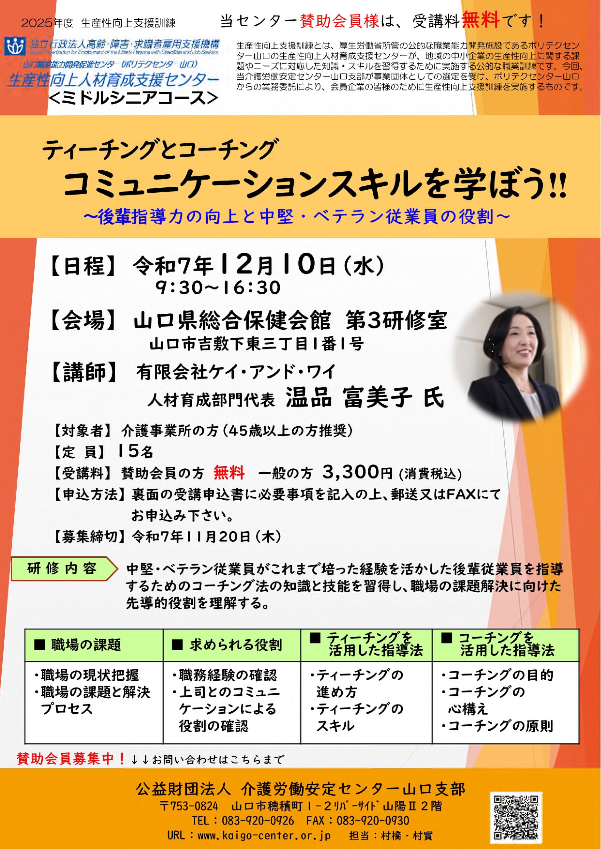 受講料:賛助会員の方 無料 一般の方 3,300円(消費税込)
