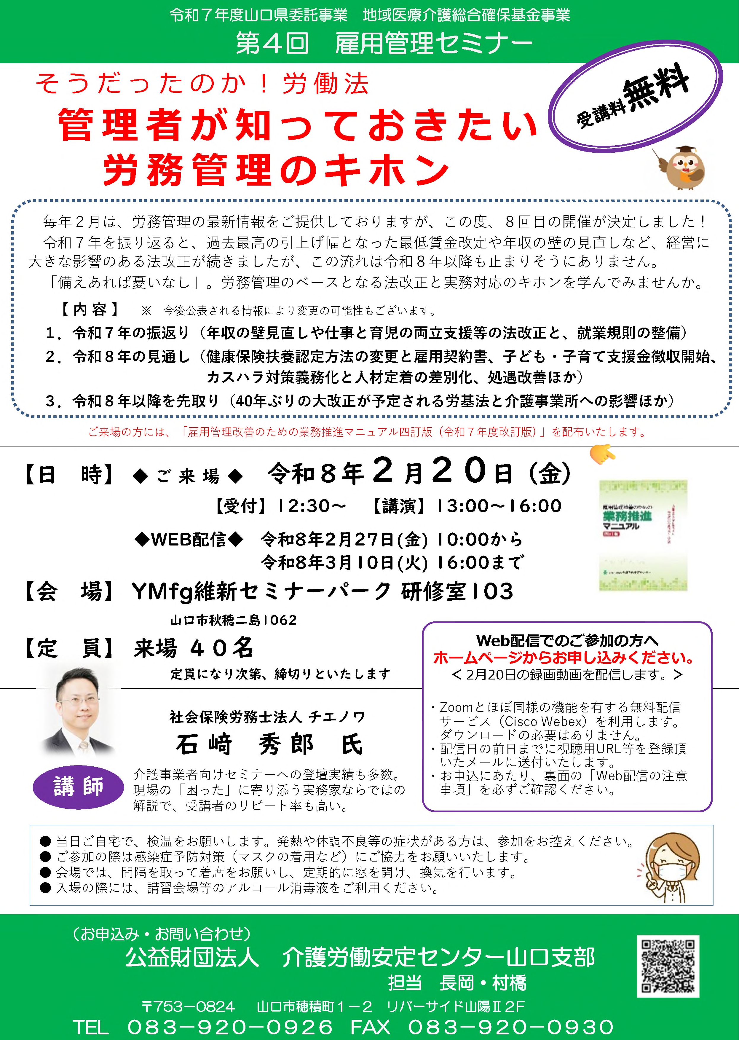 ◆令和7年度 山口県委託事業 第4回雇用管理セミナー 受講料無料!